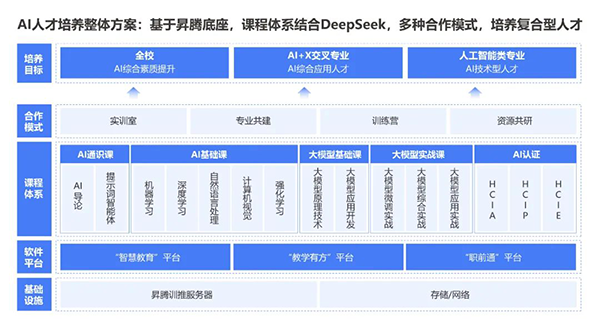 依托人工智能产业、人工智能技术及人才生态,顺利获得“技术+教育”双轮驱动,金年会jinnian以昇腾、大模型、DeepSeek等技术为核心,课程体系结合DeepSeek,覆盖AI通识教育、专业基础课、大模型课程等课程,构建从人才培养到产业落地的闭环,赋能高质量AI+场景人才输出。